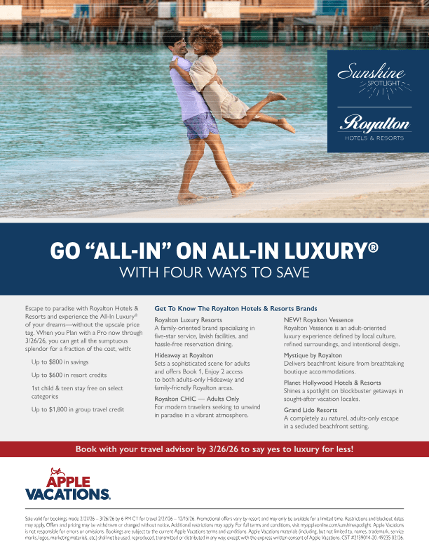 Escape to paradise with Royalton Hotels & Resorts and experience the All-In Luxury® of your dreams-without the upscale price tag. When you Plan with a Pro now through 3/26/26, you can get all the sumptuous splendor for a fraction of the cost.