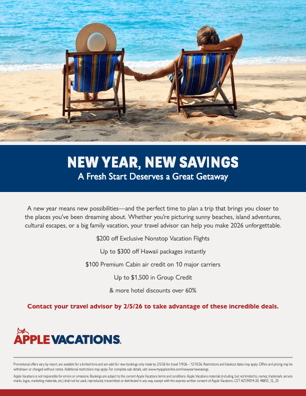 A new year means new possibilities—and the perfect time to plan a trip that brings you closer to the places you’ve been dreaming about. Whether you’re picturing sunny beaches, island adventures, cultural escapes, or a big family vacation, your travel advisor can help you make 2026 unforgettable. Up to $200 Off Flights + up to $1500 Group Credit and more!